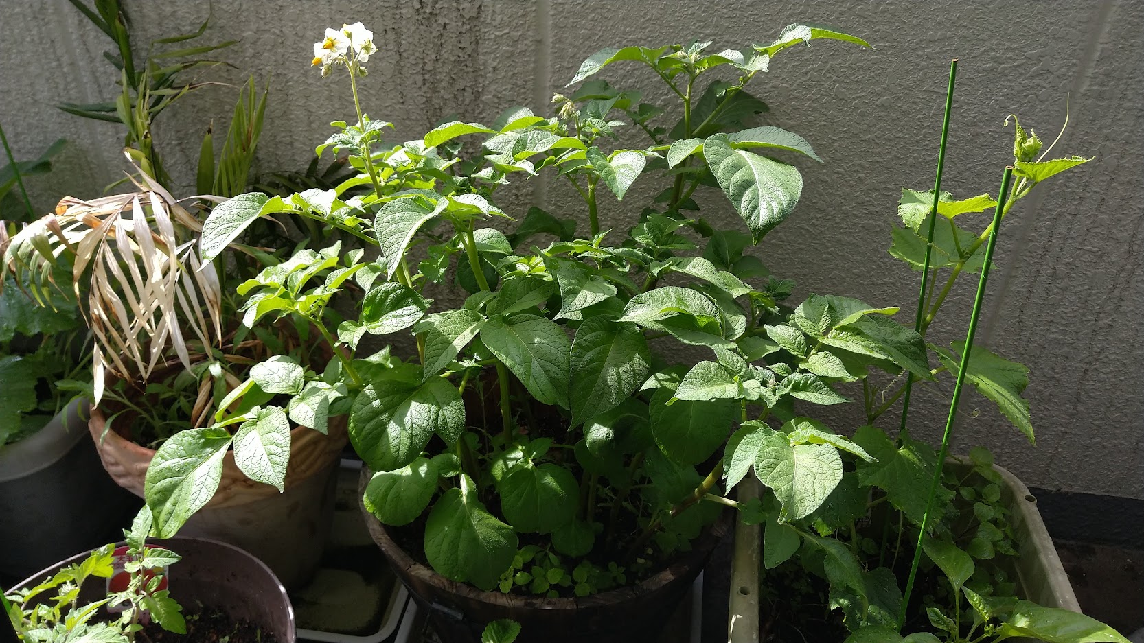 狭い丸型プランターでじゃがいも。